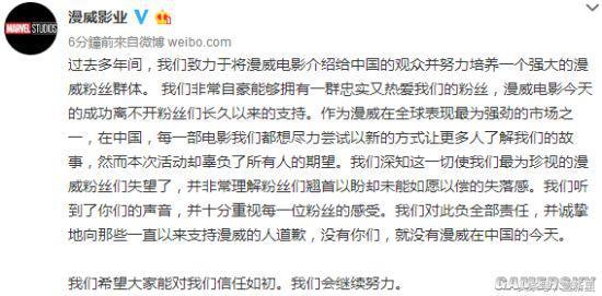 原文:@漫威影业:过去多年间,我们致力于将漫威电影介绍给中国的观众并努力培养一个强大的漫威粉丝群体。 我们非常自豪能够拥有一群忠实又热爱我们的粉丝,漫威电影今天的成功离不开粉丝们长久以来的支持。作为漫威在全球表现最为强劲的市场之一,在中国,每一部电影我们都想尽力尝试以新的方式让更多人了解我们的故事,然而本次活动却辜负了所有人的期望。我们深知这一切使我们最为珍视的漫威粉丝们失望了,并非常理解粉丝们翘首以盼却未能如愿以偿的失落感。我们听到了你们的声音,并十分重视每一位粉丝的感受。我们对此负全部责任,并诚挚地向那些一直以来支持漫威的人道歉,没有你们,就没有漫威在中国的今天。