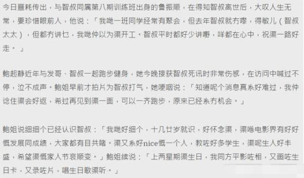 好友鲍起静28日得知智叔去世在电话里放声大哭、泣不成声,她说前段时间才拍片给智叔打气:“知道这个消息真的好难过,我还以为他会好,希望再见到他一面,可以一起跑步,原来已经没有机会。”