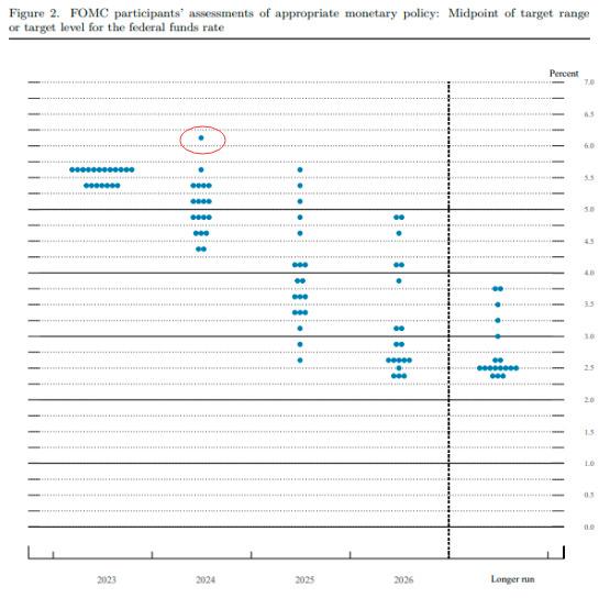 而且需要注意的是,点阵图对今年年底利率的预测,并不完全代表本轮加息周期的峰值利率。因为完全存在这样一种情况:即美联储在明年一季度再加息一次,直到下半年或四季度大幅降息,从而造成把点阵图上明年底的预测 " 压回来 " 的效果。