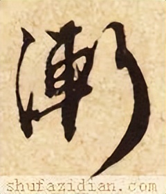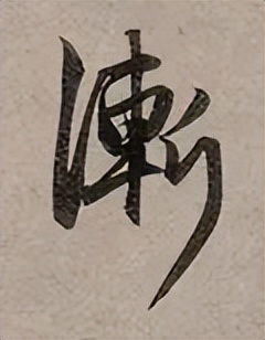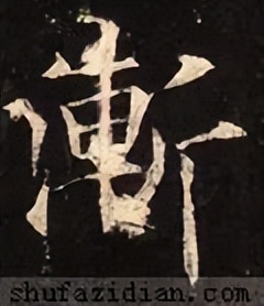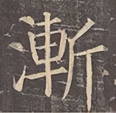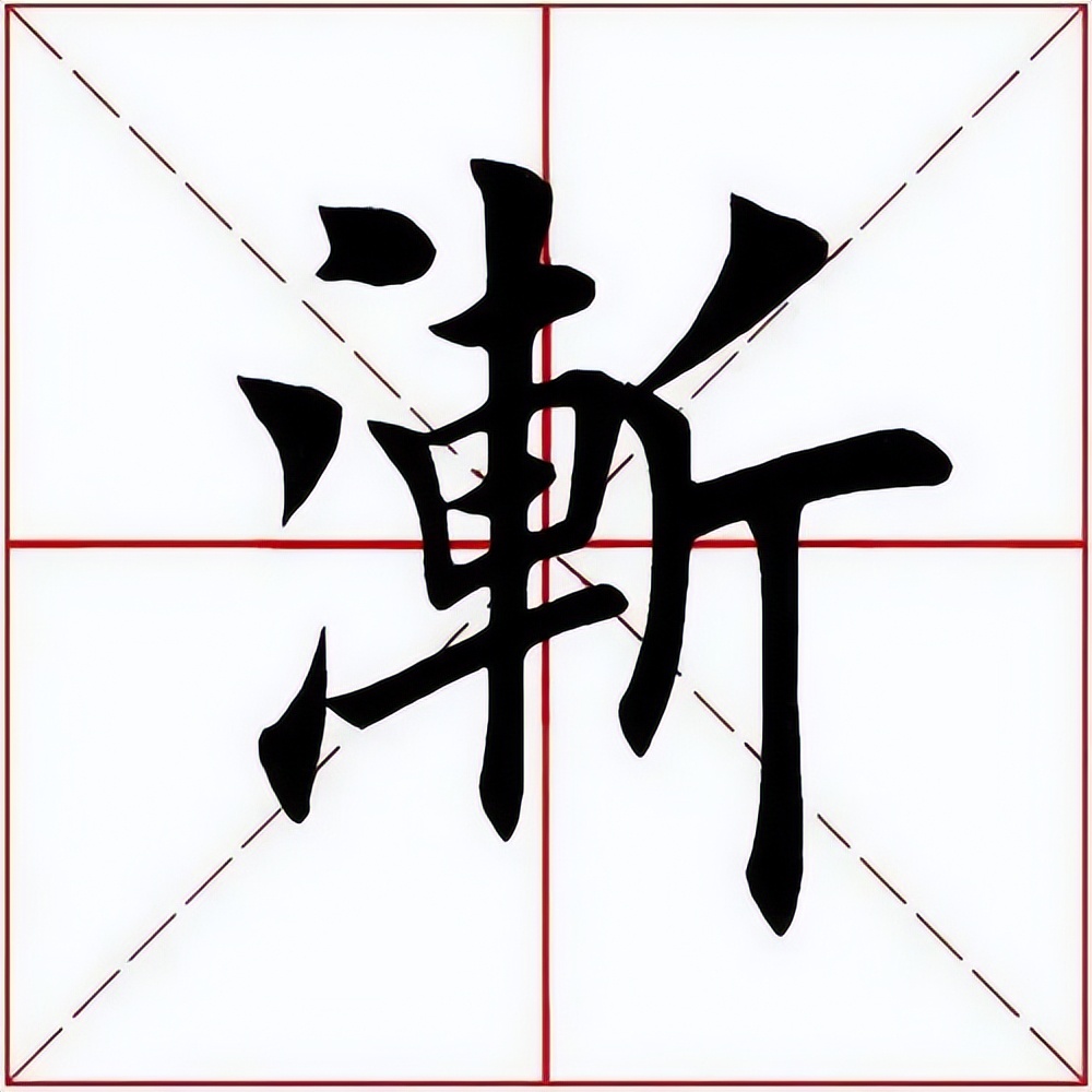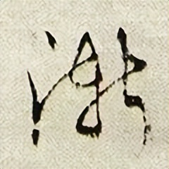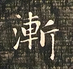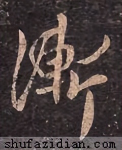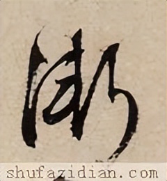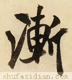 左部“氵”旁整体左斜,不要写宽。首点饱满,收笔向左回锋,以引出下一笔;第二点起笔呼应首点,与首点的位置要稍近、偏左,收笔向左下出锋,以带出第三点; 第三点在第二点的下方,距离稍远,呼应第二点,向右下切笔,然后回锋上提,不要写长,注意指向。