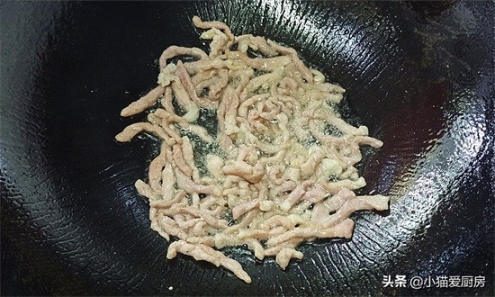 【步骤三】:热锅冷油,把腌制好的肉丝倒入锅中,用中火滑散炒熟,然后盛出来备用。