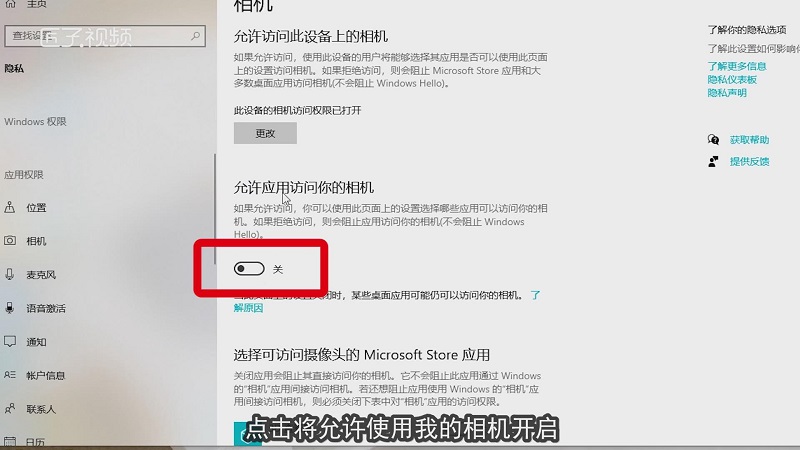 4、点击将允许使用我的相机开启,这样就可以使用电脑的摄像头了。