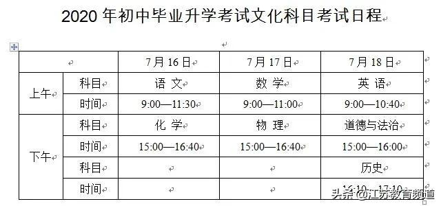 今年全扬州市初中毕业升学考试文化科目考试时间为7月16日—18日。初二地理、生物考试时间为7月15日上午,地理考试时间为 9:00—10:00,生物考试时间为10:10—11:10。