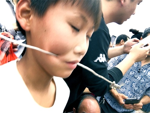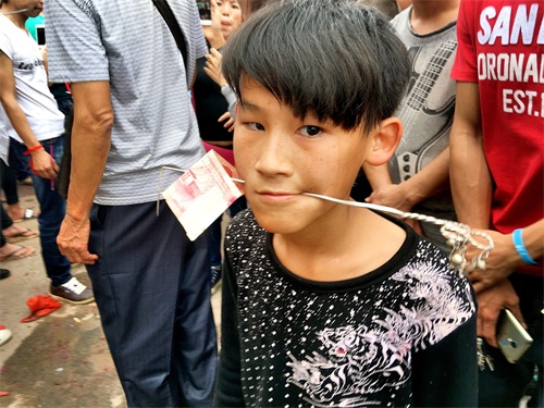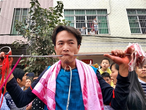昨日参加南丰镇公期,海南琼北农村基本上村村都过公期,有的地方叫军坡节,但是穿杖并不是没个村都有的,穿杖是在海南民俗活动中一种形式, 穿杖者用拇指粗的钢筋或银釺将自己的腮穿通,还有人会刺穿喉咙皮部位 ,多者几十人穿在一根釺上 了,你现场见过吗?