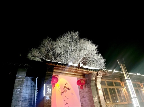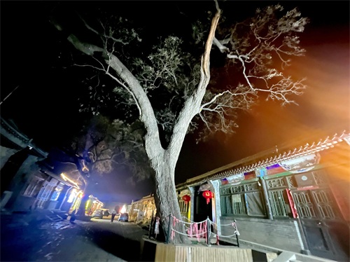 原来,经过这个火车站左转直走就到了。我们还去逛了逛周边,周边的夜景也是古色古风,北京的古树保护的非常好,都是明清时代种下的树,到现在年龄最大的树有400多岁了,边上好几家店都关门了。