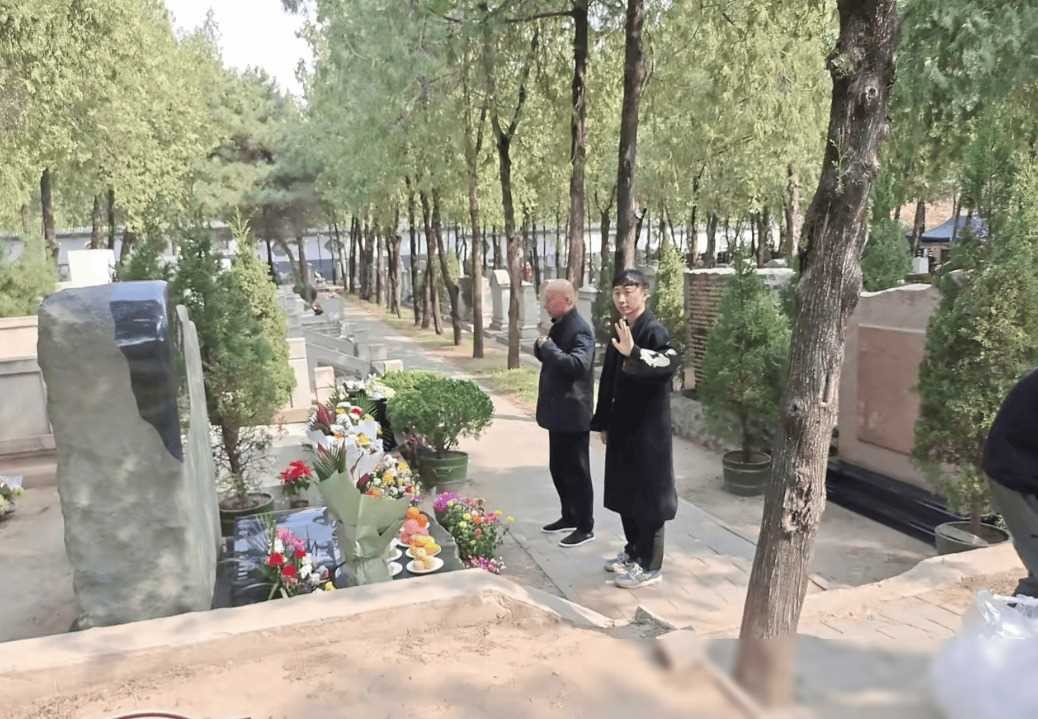 陈佩斯与陈大愚身着黑衣,神情凝重地面对陈强的墓碑,摆放着各式贡品和鲜花,表达了对逝者的深切怀念。在公众场合保持冷静和礼貌,陈大愚的修养举止更是赢得了网友的一致好评。