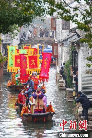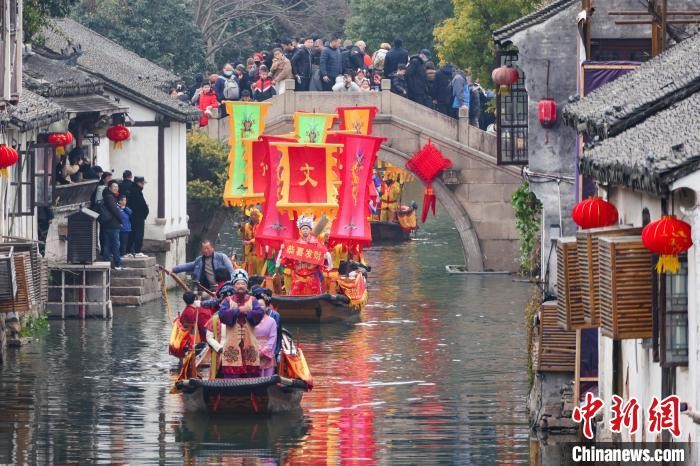 图为五路财神乘船巡游周庄古镇。中新社记者 泱波 摄