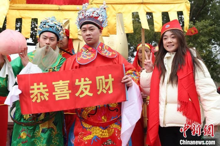 图为游客与财神合影。中新社记者 泱波 摄