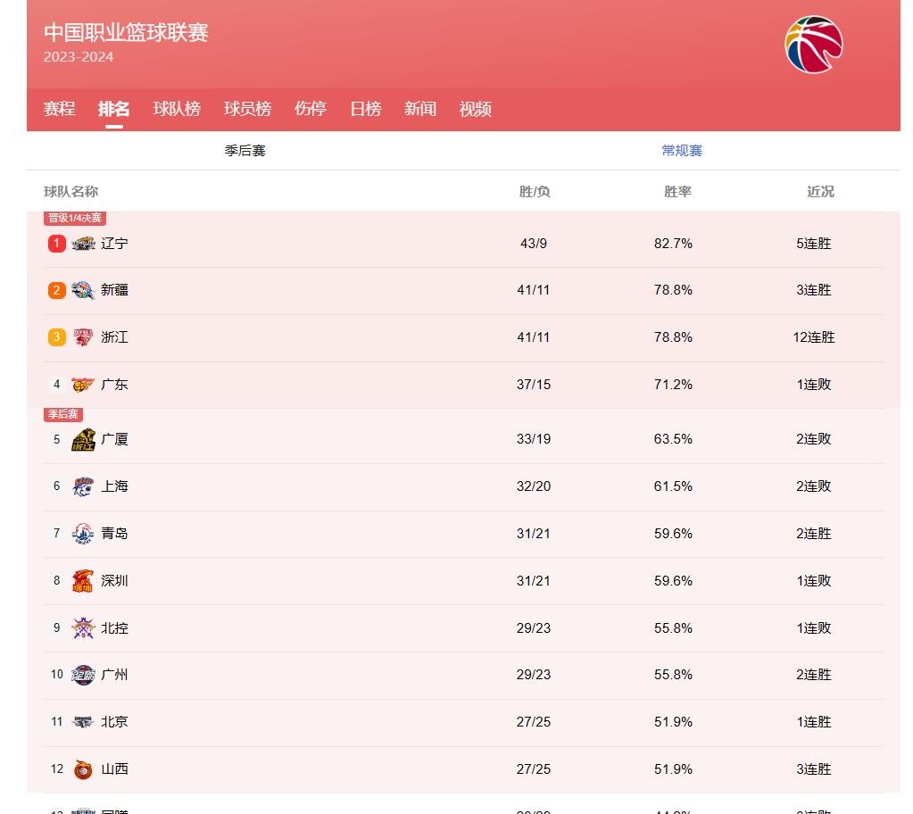 CBA常规赛排名正式出炉!辽宁第一 广东宏远第四 新疆第二 浙江第三