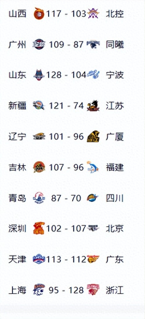随着今晚CBA常规赛最后一轮的比赛结束,本赛季CBA的排名已经正式出炉,现在让我们先一睹为快!据了解,今晚CBA常规赛总共打了11场比赛,比赛结果分别是:浙江广厦96-101不敌辽宁,广东宏远112-113输天津,北京107-102胜深圳,新疆121-74狂胜江苏,山东128-104大胜宁波,广州109-87狂胜同曦,山西117-103吊打北控,吉林107-96大胜福建,青岛87-70横扫四川,浙江128-95狂胜上海。