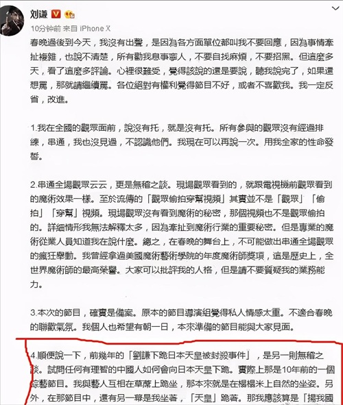那么刘谦为什么在这么严重恶劣的情况之下被封杀还能够再复出呢?其实刘谦已经做出了解释,他解释了当年为什么会给日本人下跪的事件。他说这件事其实是无稽之谈,说任何有理智的中国人都不会向日本天皇下跪的。那么为什么会出现那样一幕呢?其实是因为10年前的一个综艺节目,他和日本人互相坐在草席上跪坐,本来就是在榻榻米上自然的坐姿却被恶意的改造成了给日本人下跪。早该吃了,还有就是另一方面就是他做的,天皇是跪着的,他并没有给天皇下跪,所以在这个时候把误会给解开了。