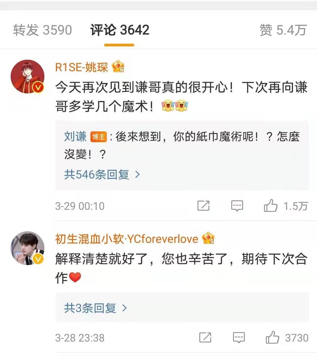 刘谦这也应该是第1次失误,叫错人名吧可能觉得非常的尴尬。在评论区中很多网友都说解释清楚就好了,你也辛苦了,期待下次合作。当然姚琛也给刘谦评论了,他说道:“今天再次见到谦哥,真的很开心,下次再向谦哥多学几个魔术。