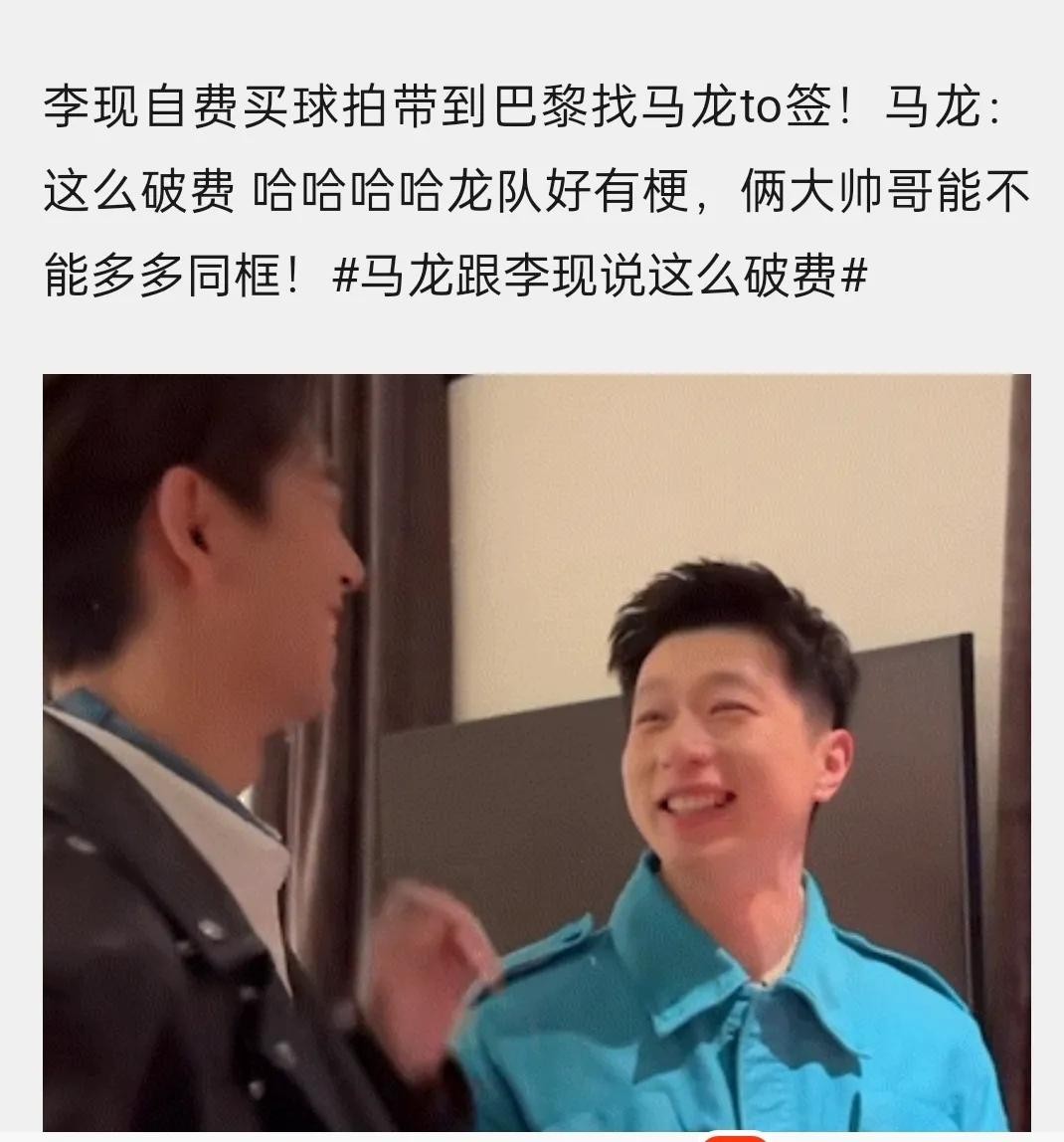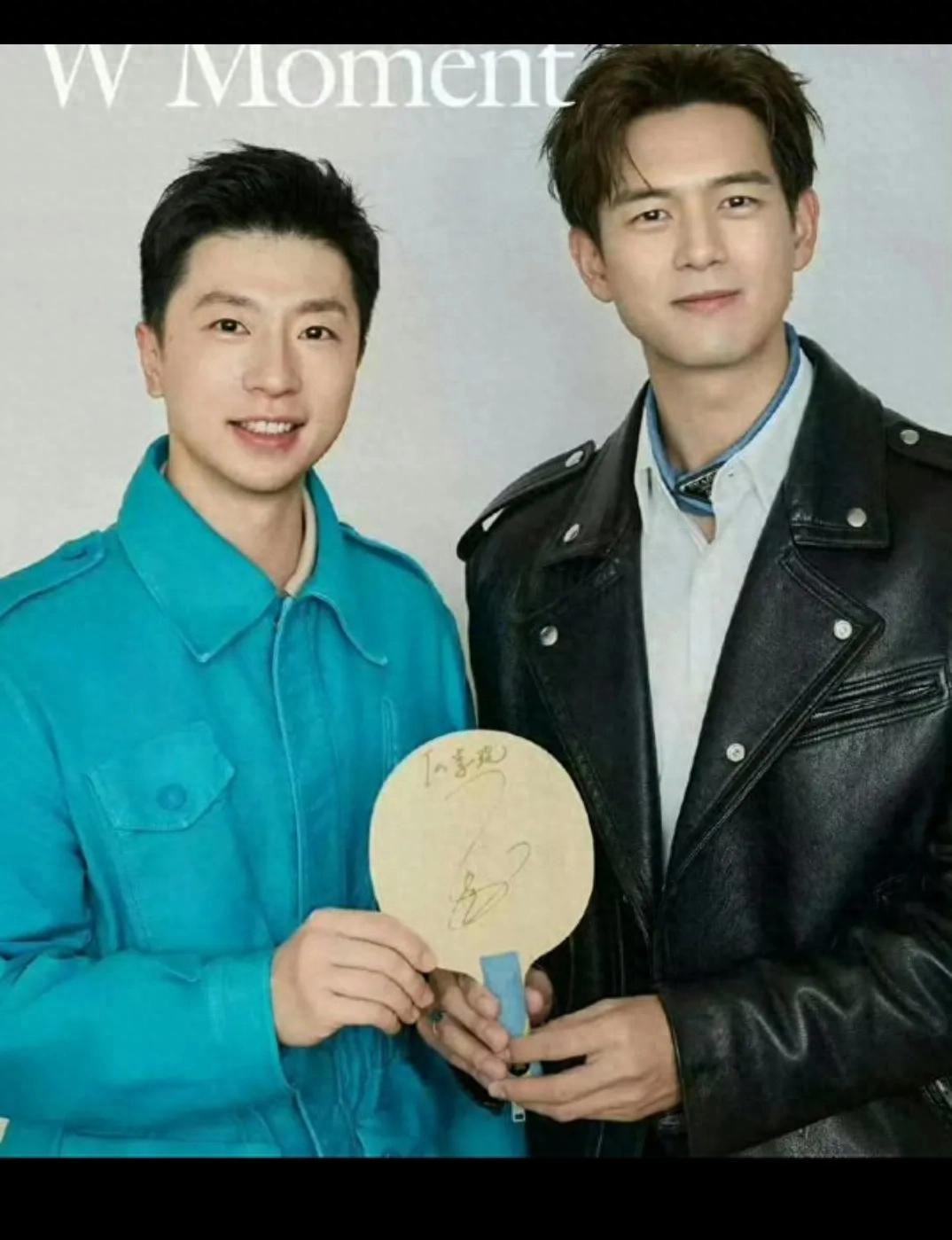 照片中,李现身穿休闲装,面带微笑,眼神中透露出对马龙的崇拜之情。而马龙则显得从容不迫,手持签名笔,准备为李现签名。这一幕温馨而有趣,展现了明星与奥运冠军之间的友好互动。