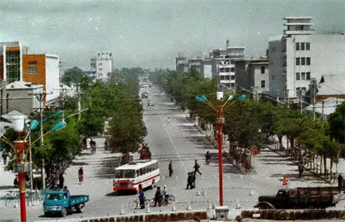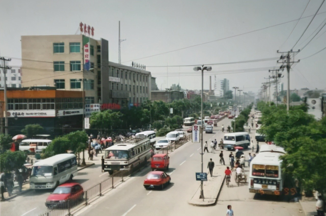 图为九十年代市区内的一条街路,车辆行人都很多,人来车往非常热闹。