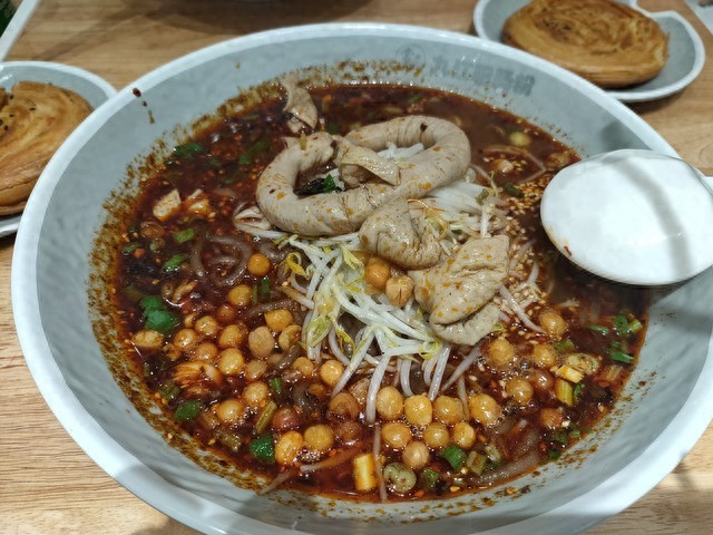 将煮好的米粉放入碗中,加入炖煮过的大肠,倒上卤水和炒好的辣椒油。