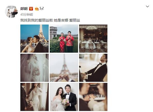 今晚6时许,钢琴家郎朗在微博上公布自己结婚喜讯,晒出九张婚纱照并表白,“我找到我的爱丽丝啦 她是吉娜 爱丽丝”。