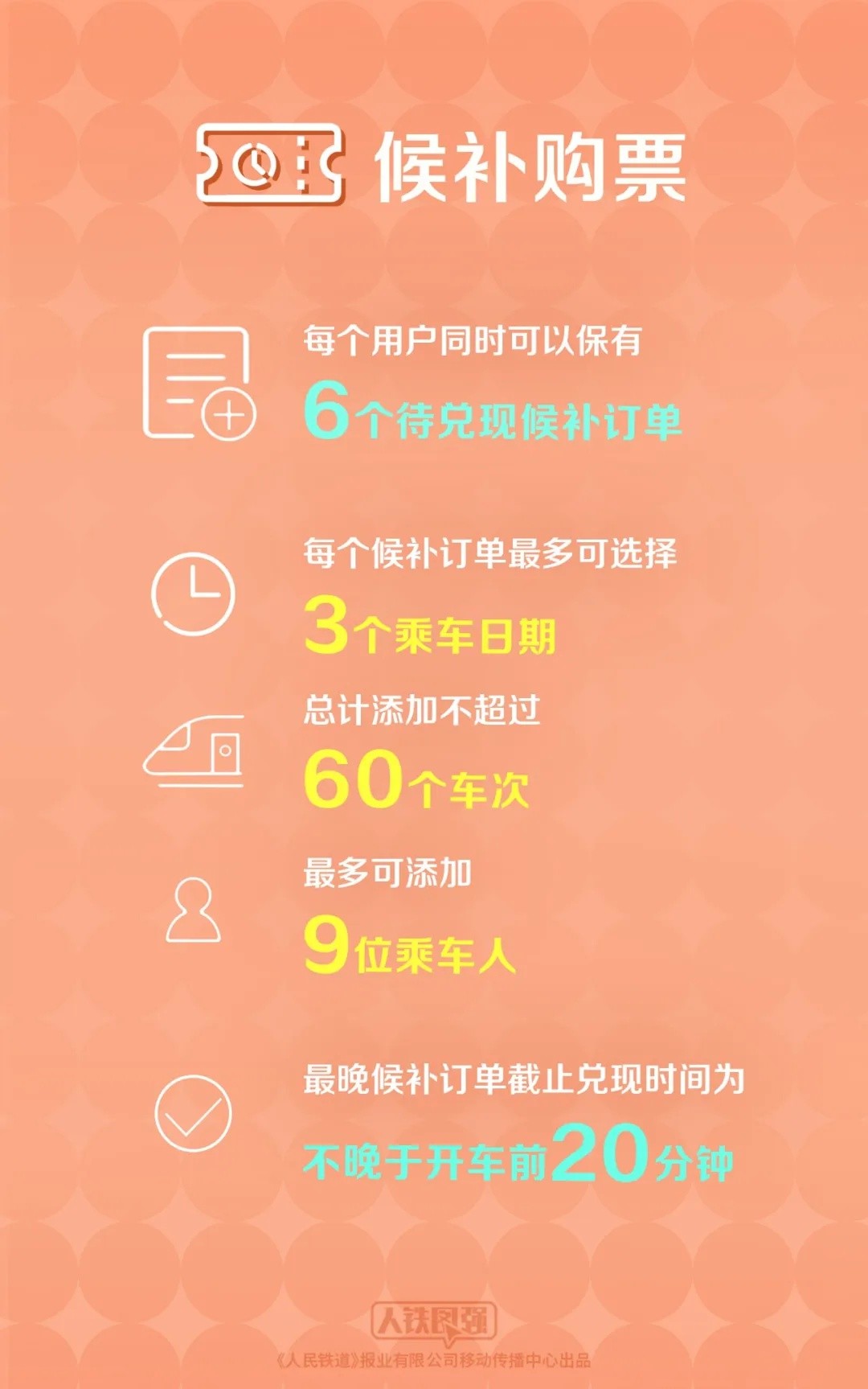 候补购票每个用户可以有6个待兑现候补订单每个候补订单最多可选择3个乘车日期总计添加不超过60个车次