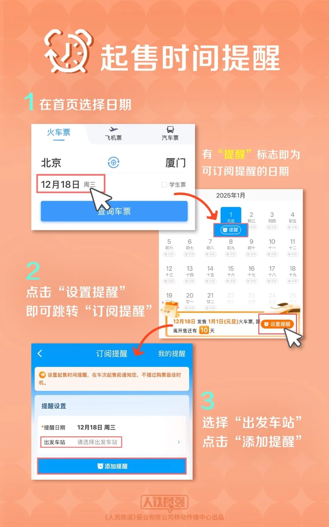 起售时间查询打开铁路12306App首页选择日期选择要购票日期点击“设置提醒”即可跳转“订阅提醒选择“出发车站”后点击“添加提醒”即可
