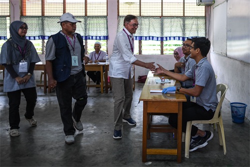 10月13日,在马来西亚森美兰州波德申一处投票站,马来西亚前副总理安瓦尔(前排左三)与工作人员握手。