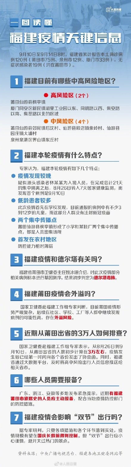 【福建加油!一图读懂福建疫情关键信息】9月10日至14日8时,福建已累计报告本土阳性病例139例。福建本轮疫情有什么特点?目前有哪些中高风险区?莆田疫情还会外溢吗?福建疫情会影响双节出行吗?戳图了解