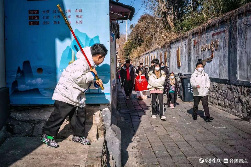 1月28日,济南市历下区西更道街。小男孩手持“金箍棒”隐藏在墙角处,准备来一场“恶作剧”。