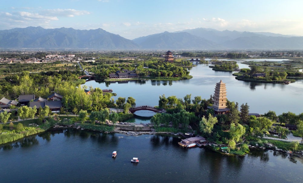 渼陂湖风光(7月7日摄,无人机照片)。新华社记者 陶明 摄