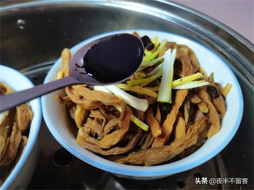 放一组辅料在下面,肉在上面照片,这里选的辅料主要是干豆角,也可以放豆腐干、土豆条,调料主要是葱、姜、豆豉。