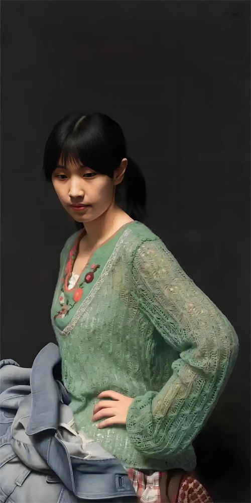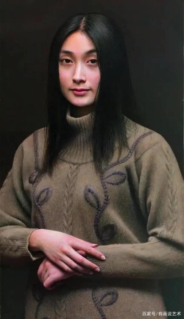 这个是冷军的蒙娜丽莎,不是达芬奇的蒙娜丽莎,完全是两种风格的画作,冷军的蒙娜丽莎与达芬奇的造型一样,但是冷军的刻画就要细致多了,毛衣的那种一针针织出来的感觉,甚至毛衣上的毛球,每一根乌黑的头发丝,对手部的绘画,真的非常逼真细致的绘画出来。