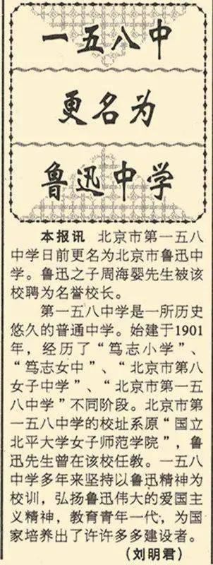 北京市鲁迅中学始建于1901年,为当时基督教圣公会创办的笃志学堂,后改为“笃志女中”。1949年建国后改为北京市第八女子中学,后于1958年学校迁入京师女子师范学堂(是中国最早的国立女子师范学堂。1908年御史黄瑞祺请设于北京。初借八角琉璃井医学馆为校舍,1910年7月迁入宣武门内石驸马大街斗公府新校舍。1912年改名北京女子师范学校。1919年改称北京女子高等师范学校,1931年7月,该院正式并入北平师范大学,1920年至1926年期间李大钊受聘于该校,北方妇女运动领导人夏之栩、中共第一位女党员缪伯英(1899~1929.10)出自该校,“三一八”惨案刘和珍和杨德群两位烈士就是当时该校的预科生,“不在沉默中爆发,就在沉默中灭亡……”这段为现今师生们耳熟能详,摘自鲁迅《记念刘和珍君》的片段,也正是对这一事件的纪念)的旧址(现北京新文化大街45号校址),1972年改称北京第一五八中学,1977年,学校明确把刘和珍、杨德群烈士的事迹和鲁迅在校工作和战斗的情况列为学校一项传统的德育内容,作为学校对学生进行爱国主义教育的主渠道。