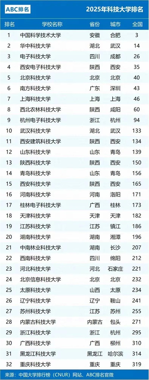 近日,2025年ABC全国科技大学排名正式发布,榜单涵盖32所国内以“科技”命名的重点高校。