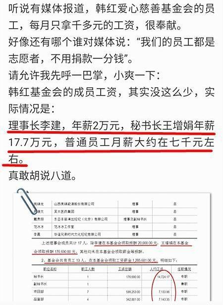 他首先直接曝光韩红基金会的工资账单,“韩红基金会的成员工资,其实没这么少,实际情况是:理事长李建,年薪2万元,秘书长王增娟年薪17.7万元,普通员工月薪大约在七千元左右。”