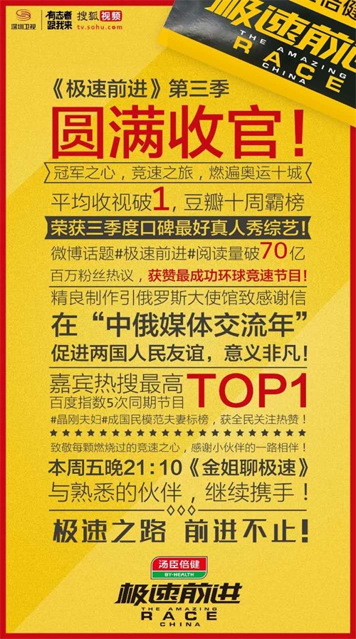 汤臣倍健《极速前进》第三季圆满收官!平均收视破1,豆瓣十周霸榜,百万粉丝热议,被评三季度口碑最好真人秀!更收到俄罗斯驻华大使馆发来感谢信,获赞“在中俄媒体交流年,促进两国人民友谊,意义非凡”。极速之路,前进不止。本周五晚21:10,锁定深圳卫视搜狐视频,《金姐聊极速》与你继续#极速前进#!