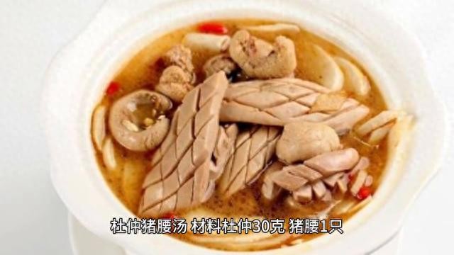 材料:杜仲30克、猪腰1只。做法:猪腰洗净,剖开薄膜及臊腺切片,杜仲洗净。猪腰与杜仲一起放入砂锅内小火熬40分钟。吃猪腰饮汤,功效补肾助阳。