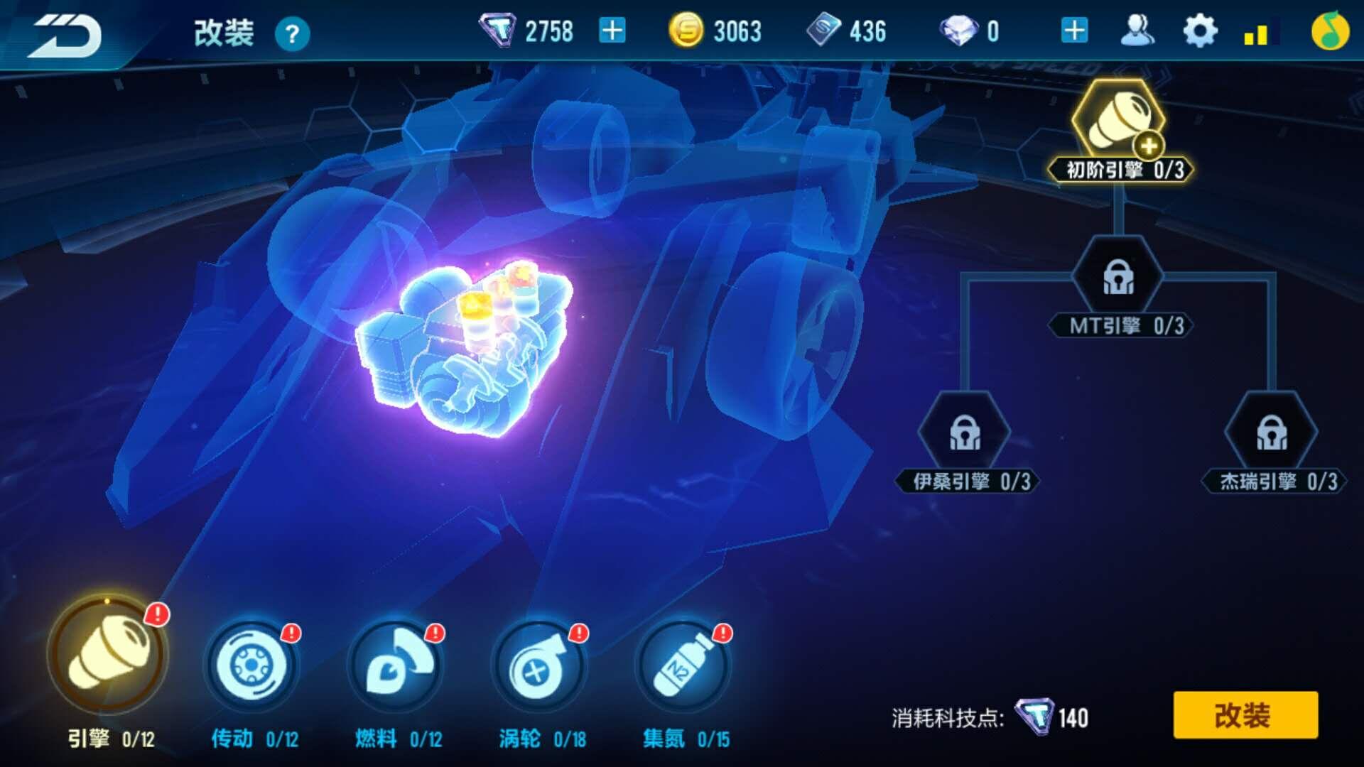 不同的车辆有不同的改装科技树结构,由赛车本身的特性决定,在改装过程中,必须将当前节点改装为3\3,才能继续往下一个新的节点进行改装。