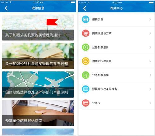 “政策信息”提供了公务机票购买管理改革相关政策要求及规定,供购票人随时随地了解相关知识及要求。“帮助中心”汇总了公务机票购买过程中常见的问题及解决方案,例如:最新公告、购票渠道与方式、公务机票票价、退票及行程变更、公务机票报销等七个方面的常见问题,购票人在购票过程中遇到疑问,可查阅该模块,获取解决方案。