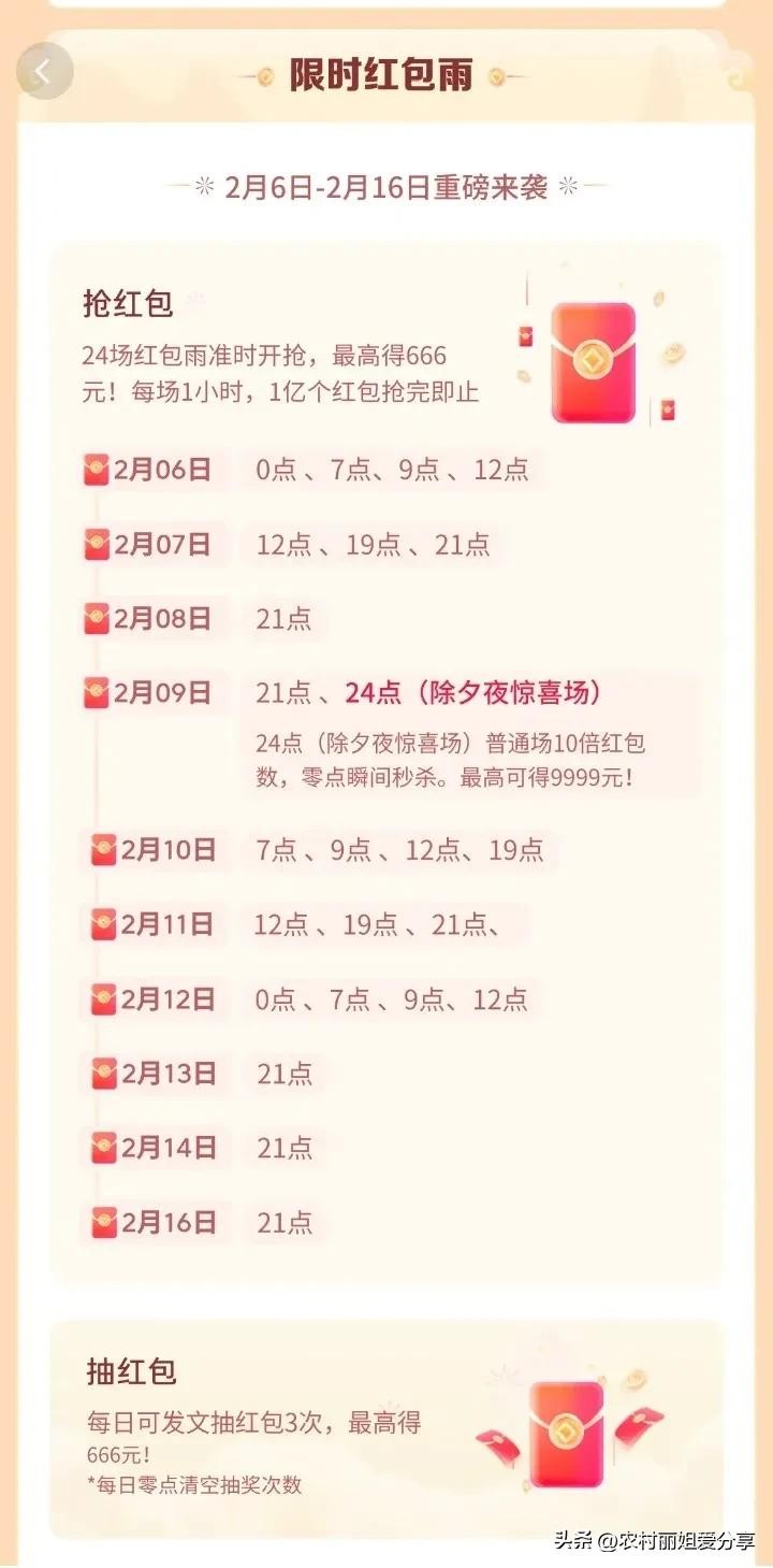 限时红包雨,时间安排——2月6号到2月16号。抢红包雨的时候要注意点不要错过机会,每次红包雨就一个小时,在这里,我再补充一下,想要抢红包,必须得先发文,发文一次就可以得到一个抽红包机会,我是一个小时抽到三个红包。