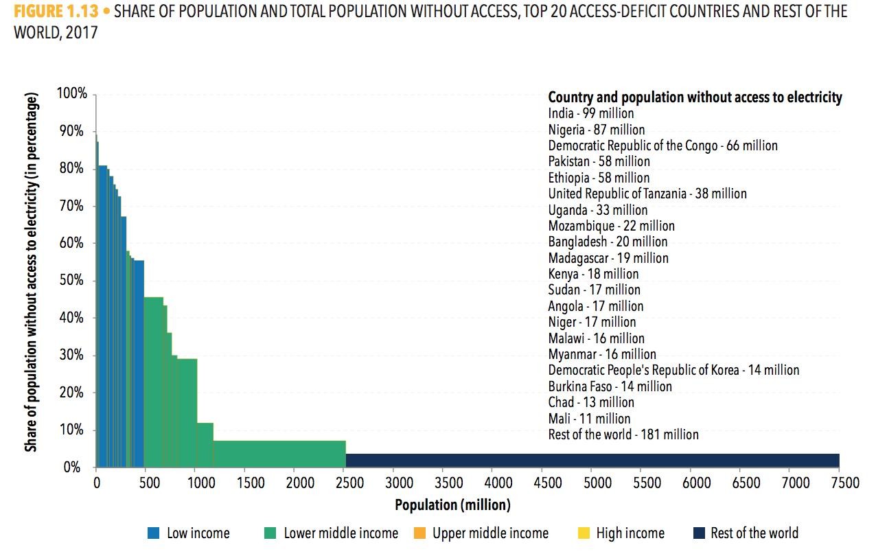 截至2017年,有96个国家未实现100%供电,其中大部分位于撒哈拉以南非洲、中亚和南亚地区。而印度是全球无电人口最多的国家,有9900万人无法用电。之后是尼日利亚(8700万)、民主刚果(6600万)、巴基斯坦(5800万)、埃塞俄比亚(5800万)、坦桑尼亚(3800万)、乌干达(3300万)、莫桑比克(2200万)、孟加拉国(2000万)、马达加斯加(1900万)、肯尼亚(1700万)、苏丹(1700万)、安哥拉(1700万)、尼日尔(1700万)、马拉维(1600万)、缅甸(1600万)、朝鲜(1400万)、布基纳法索(1400万)、乍得(1300万)以及马里(1100万)。